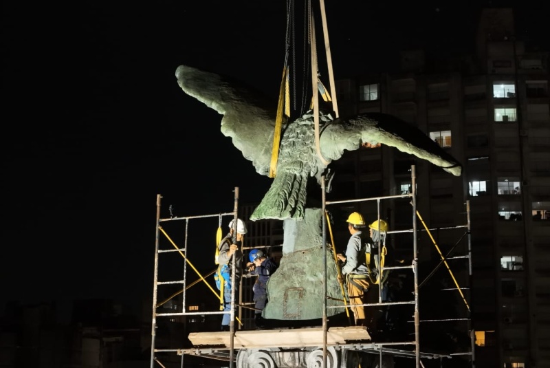 La reubicación de la obra forma parte de la reconstrucción del espacio público que lleva adelante la Municipalidad de La Plata en la plaza de avenida 7 y 44 y es la etapa final de un minucioso trabajo de puesta en valor que comenzó con el desmonte de sus partes: el águila, los tres cilindros de granito que formaban el fuste y cada una de las piezas que revestían el basamento de mampostería.
