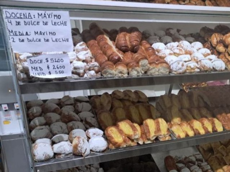 En la imagen se puede ver un cartel pegado en la vitrina donde están exhibidas las facturas que dice: “Docena: Máximo 4 de dulce de leche; media: Máximo 2 de dulce de leche”.