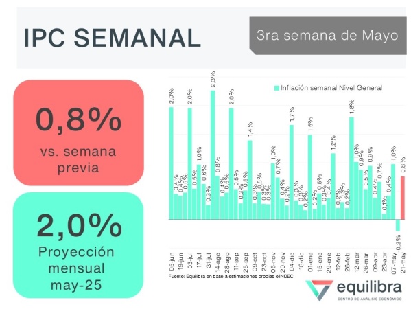 De esta manera, desde Equilibra indicaron que el promedio de inflación de las últimas cuatro semanas fue de 1,8%, mientras que para la totalidad de mayo estimaron que la inflación será del 2%.