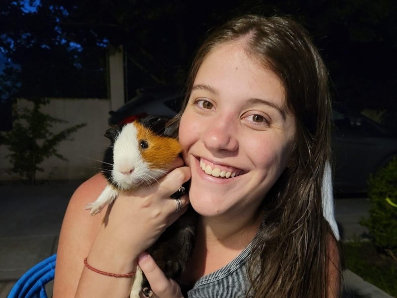 Todo arrancó en 2018, cuando Agustina decidió adoptar a Pipa, un cobayo que desde el primer día se volvió su compañero inseparable. “Fue la mejor decisión que tomé”, dice con seguridad. Pipa la acompañó durante toda su carrera en la UNLP, entre apuntes, parciales y jornadas eternas de estudio.