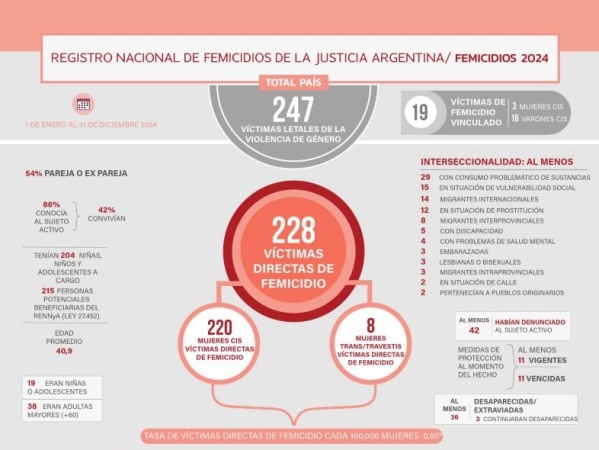 El dato de los femicidios es producto de la undécima edición del Registro Nacional de Femicidios de la Justicia Argentina (RNFJA), que elabora la Oficina de la Mujer de la Corte Suprema de Justicia de la Nación (OM-CSJN). De este informe se desprende también el dato de que en 2024 hubo en promedio una víctima directa de femicidio cada 39 horas. Si se incluye a las víctimas de femicidio vinculado los datos dan cuenta de una víctima de la violencia letal de género cada 36 horas. El promedio es de más de 18 femicidios directos por mes.