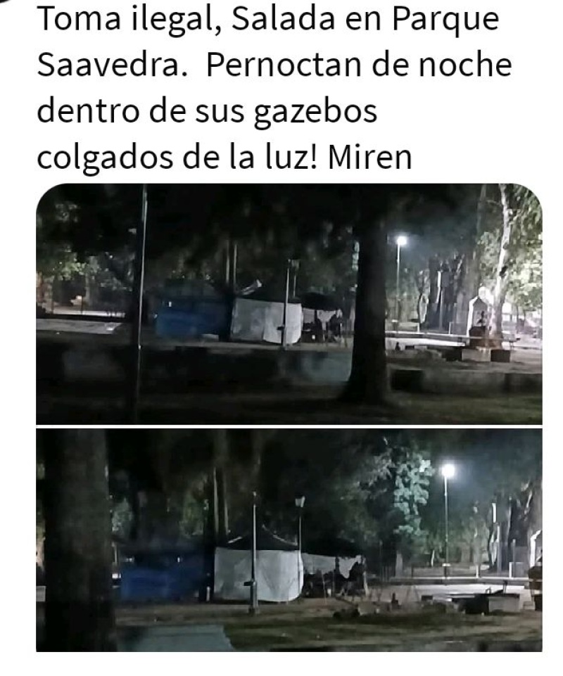 Una vecina denunció a la Municipalidad de la ciudad sacando fotos a los acampes en el parque y manifestó: "Pernoctan de noche dentro de sus gazebos colgados de la luz".