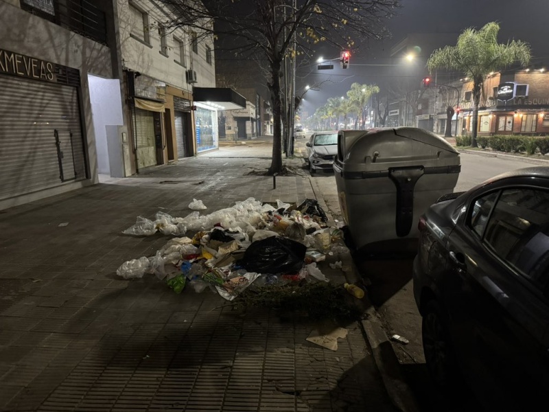 Pese a existir un contenedor para depositar los residuos, las bolsas plásticas se encuentran tiradas sobre la vereda, algunas rotas, y varias cajas y botellas de productos de limpieza.