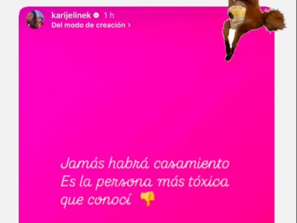 A través de su cuenta de Instagram, Pochi de Gossipeame compartió una captura de pantalla con el mensaje que subió Karina Jelinek este fin de semana contra su novia Flor Parise. “Jamás habrá casamiento. Es la persona más tóxica que conocí”, escribió la modelo.