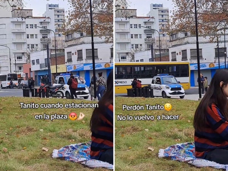 En las imágenes vemos como los agentes de seguridad interceptan a un hombre y se ve que le advierten que no puede dejar su moto estacionada en la plaza, por lo cuál procede a moverla y mientras lo hace la creadora agrega un texto de diálogo que reza: “Perdón, Tanito, no lo vuelvo a hacer”.