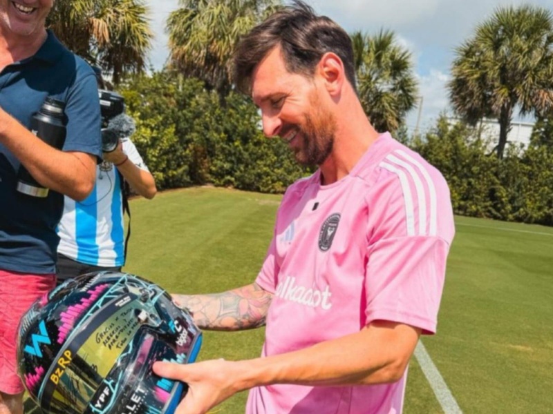 En la imagen que compartió en sus redes sociales, se lo ve a Messi sosteniendo el casco personalizado, que incluye una dedicatoria muy especial: “Gracias por todas las alegrías y aprendizajes”.