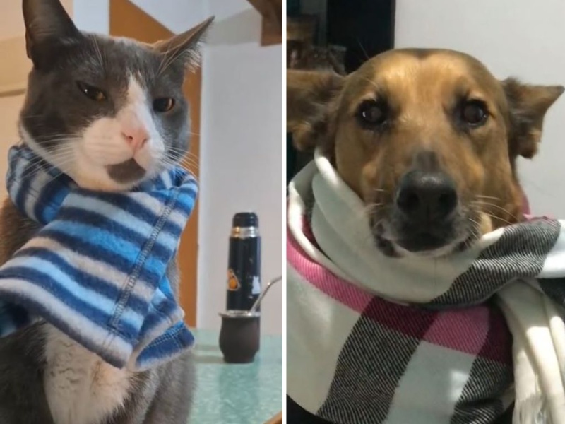 "¿Oscar, qué te has puesto, una bufanda? ¿Andás con frío? ¡Qué linda te queda!" dice una voz de hombre con un tono algo paisano. Con esta pregunta de fondo, gatos y perros lucieron sus pulóveres y pañuelos a pesar de no tener que salir de sus casas.