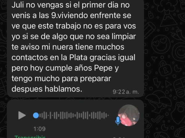 Lo que siguió fue un mensaje tajante de su jefa, Carmen: “Juli, no vengas. Si el primer día no venís a las 9 viviendo enfrente, se ve que este trabajo no es para vos. Si sé de algo que no sea limpiar te aviso, mi nuera tiene varios contactos en La Plata. Gracias igual. Hoy cumple Pepe y tengo mucho para preparar, después hablamos”.