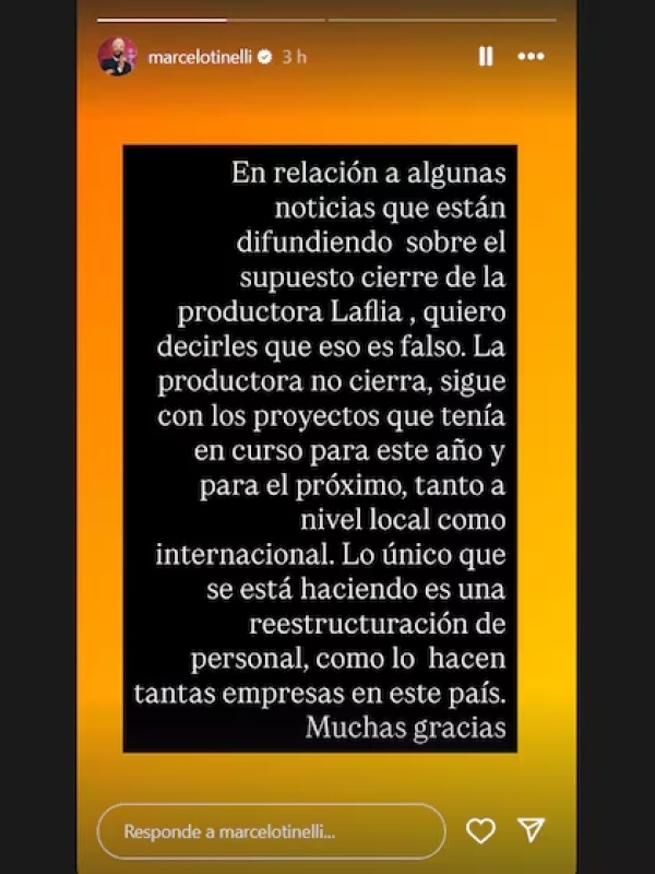 Antes de que la situación llegara a mayores, apareció Marcelo Tinelli para aclarar los tantos. "En relación a algunas noticias que están difundiendo sobre el supuesto cierre de la productora Laflia, quiero decirles que eso es falso. La productora no cierra. Seguimos con los proyectos que teníamos en curso para este año y para el próximo, tanto a nivel local como internacional".