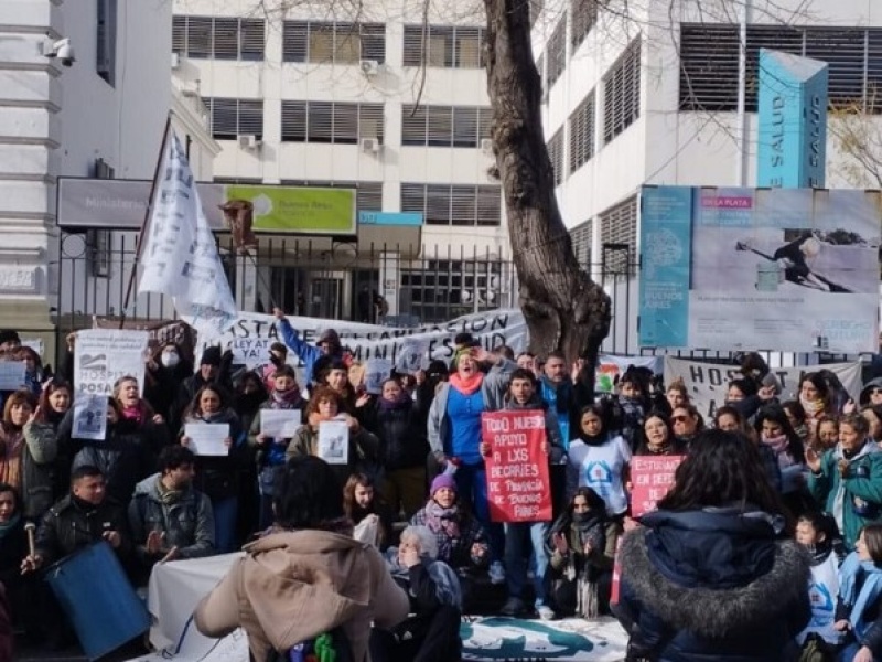 Trabajadores del Ministerio de Salud de la provincia de Buenos Aires realizaron este jueves una concentración en las afuera de la sede central en Avenida 51 entre 17 y 18 de La Plata para visibilizar su reclamo por pase a planta permanente y aumento salarial.