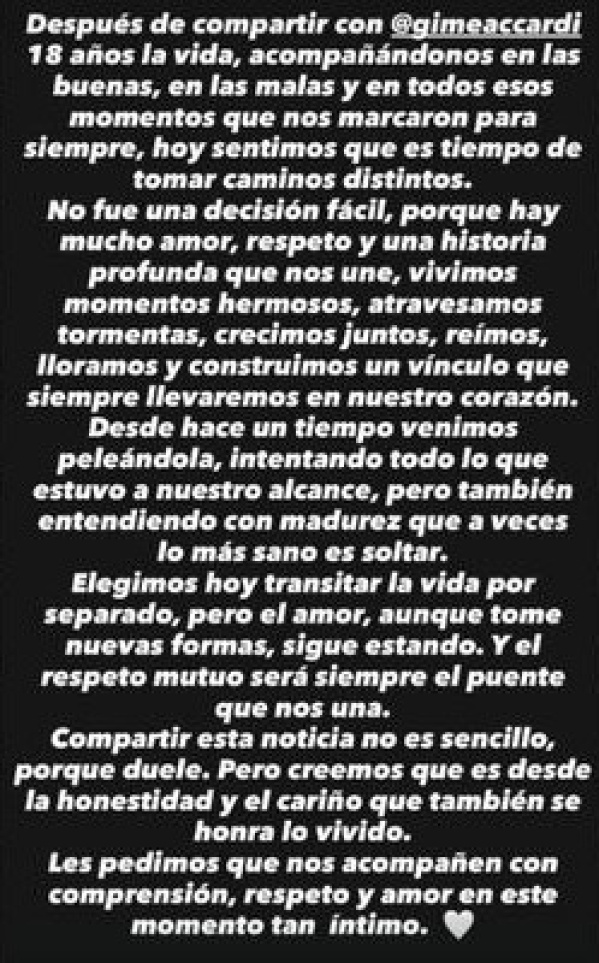 “Después de compartir con @gimeaccardi 18 años la vida, acompañándonos en las buenas, en las malas y en todos esos momentos que nos marcaron para siempre, hoy sentimos que es tiempo de tomar caminos distintos”, escribió Nico.