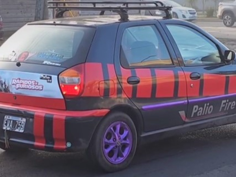 El vehículo fue visto circulando por las calles platenses con un diseño único: franjas negras y naranjas al mejor estilo street racing, llantas violetas, stickers de “Rápidos y Furiosos” y hasta la inscripción “Palio Fire” en tipografía impactante.