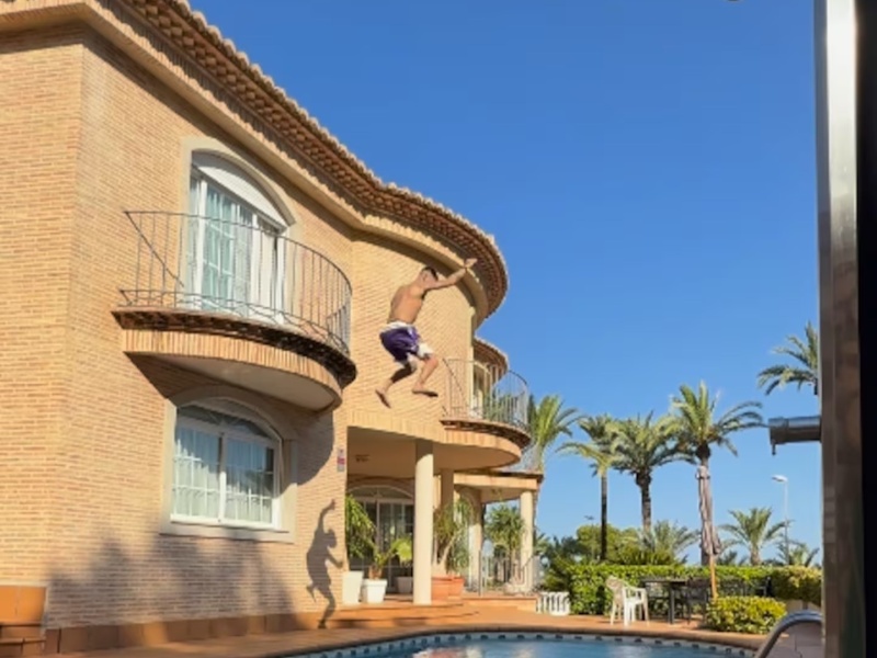 En las imágenes, se observó cómo el cantante de cumbia 420 corrió alrededor de la piscina de la casa, ingresó a la propiedad, subió hasta la ventana de una habitación ubicada en el primer piso, atravesó una reja y, sin dudarlo, se arrojó directamente al agua, sin tomar ningún tipo de precaución.