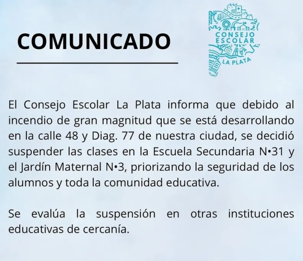 Desde el Consejo comentaron que, "debido al incendio de gran magnitud que se está desarrollando en la calle 48 y Diag. 77 de nuestra ciudad, se decidió suspender las clases en la Escuela Secundaria N.31 y el Jardín Maternal N.3”.