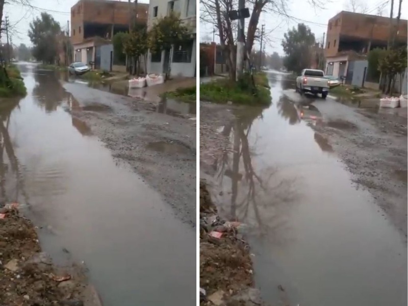 En un video que compartió por redes sociales, mostró cómo los vehículos tratan de esquivar algunos charcos y otros no les queda más opción que atravesarlos. La situación se vuelve aún más complicada para los autos chicos y bicicletas que no tienen la magnitud como para resguardarse del salpique o los patinazos.