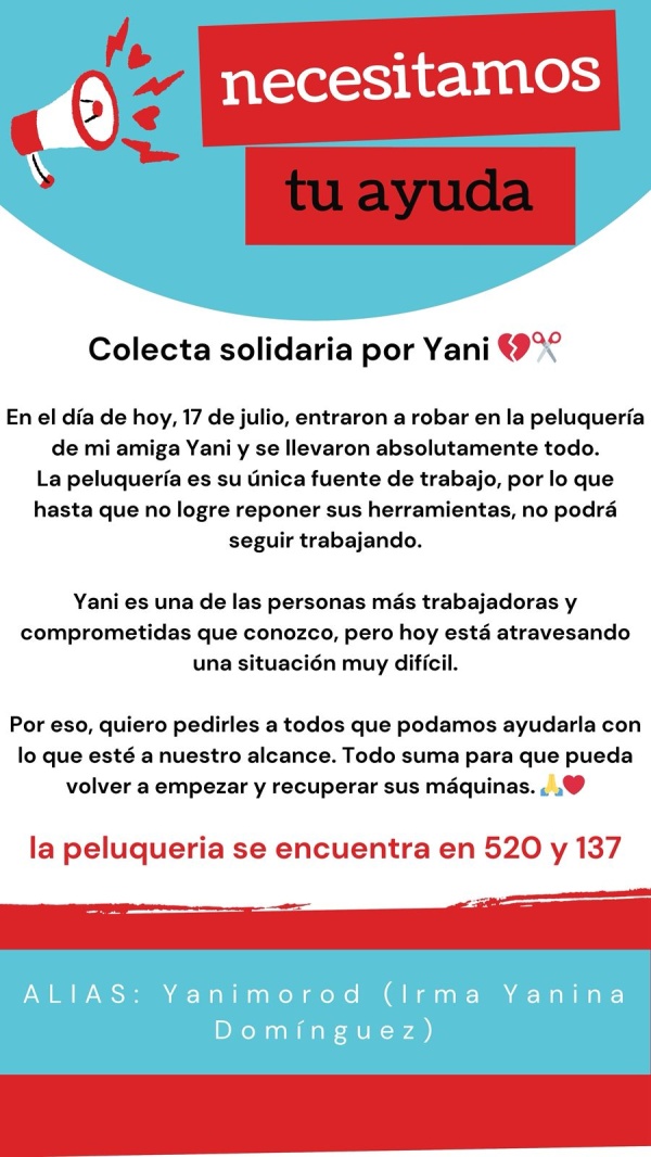 La víctima se dio a conocer como "Yani", una trabajadora independiente que desde hace años se dedica a trabajar cómo peluquera. Su local era la única fuente de ingresos y tras muchos años de arduo trabajo logró poner su propio espacio, donde atendía a sus clientas. Los ladrones se llevaron secadores, planchitas, tijeras, insumos y herramientas muy importantes que le impiden continuar con su trabajo.