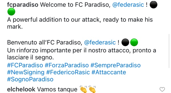 Federico Rasic, a 33 años, no pierde el sueño de seguir viviendo del fútbol y acaba de ser anunciado en su nuevo club: el ignoto FC Paradiso, de la tercera división de Suiza. Es decir, lo poco que se conoce de esta entidad por estas tierras es que fue adquirida por el grupo empresario que integra el ex delantero de River y Barcelona, Maxi López. Es otra de las inversiones que lleva adelante la firma de la que forma parte, que posee también por ejemplo al Birmingham de Inglaterra.