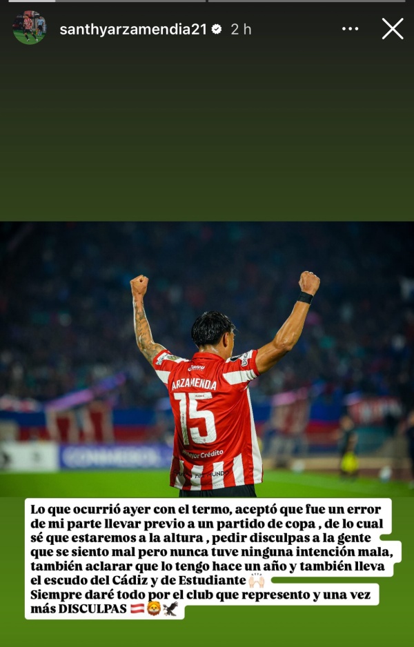 El futbolista a través de una historia en su cuenta de instagram explicó: "...Acepto que fue un error de mi parte llevar previo a un partido de copa...nunca tuve ninguna intención y lo tengo hace un año y también lleva el escudo de Cádiz y de Estudiantes"