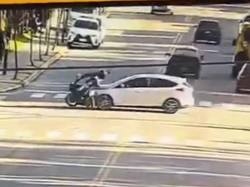 El impacto quedó registrado por una cámara de seguridad municipal, el auto chocó de lleno contra una Bajaj Rouser y el motociclista salió volando por encima del capot, cayendo violentamente sobre el asfalto.