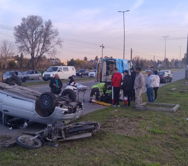 Según informaron fuentes policiales, por causas que aún se investigan, una moto Honda Wave 110 impactó contra un Volkswagen Gol Trend y un Mercedes Benz. A raíz del fuerte impacto, uno de los automóviles terminó volcado sobre la calzada.
