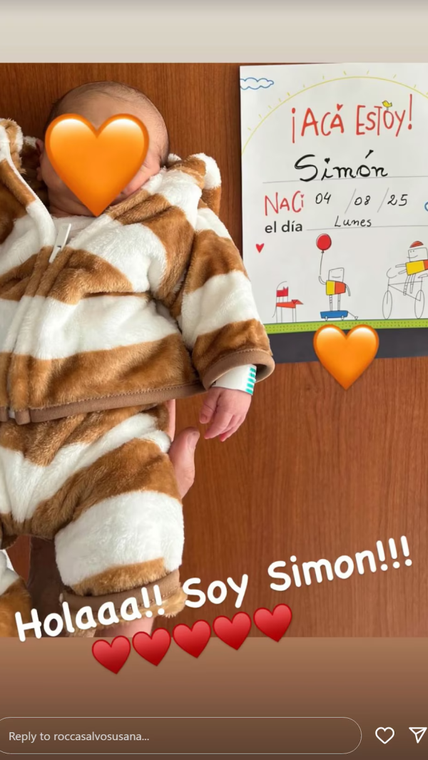 La foto publicada muestra al pequeño Simón vestido con un conjunto de peluche a rayas, acompañado por un cartel escrito a mano que dice: “¡Acá estoy! Simón”, junto con los datos del nacimiento. A través de las herramientas de texto de Instagram, Roccasalvo sumó el mensaje: “¡Holaaa! ¡Soy Simón!”, decorado con emojis de corazones, reflejando su emoción por la llegada del nuevo integrante de la familia.
