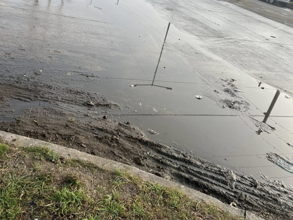 Tanto la calle como la vereda se encuentran tapadas en barro y agua, produciendo charcos en los desniveles del paso vial, especialmente en las cercanías con el cordón, y una superficie resbaladiza que hace que los transeúntes se encuentren más propensos a sufrir golpes.