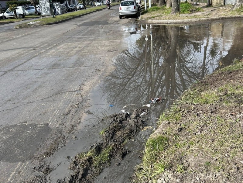Tanto la calle como la vereda se encuentran tapadas en barro y agua, produciendo charcos en los desniveles del paso vial, especialmente en las cercanías con el cordón, y una superficie resbaladiza que hace que los transeúntes se encuentren más propensos a sufrir golpes.