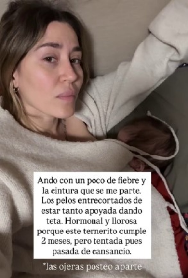 Más tarde, compartió el malestar que siente en estos días. “Estoy con un poco de fiebre y la cintura que me duele muchísimo, el cabello desordenado de estar mucho tiempo apoyada dando pecho. Hormonal y llorona porque este bebé cumple 2 meses, pero agotada, realmente sin energía. Las ojeras las dejo para otro post”, comentó entre risas y quejas.