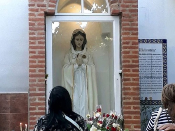 Asimismo, en el patio, la figura de la Rosa Mística se erige como centro de devoción, rodeada de mensajes de fe y gratitud.