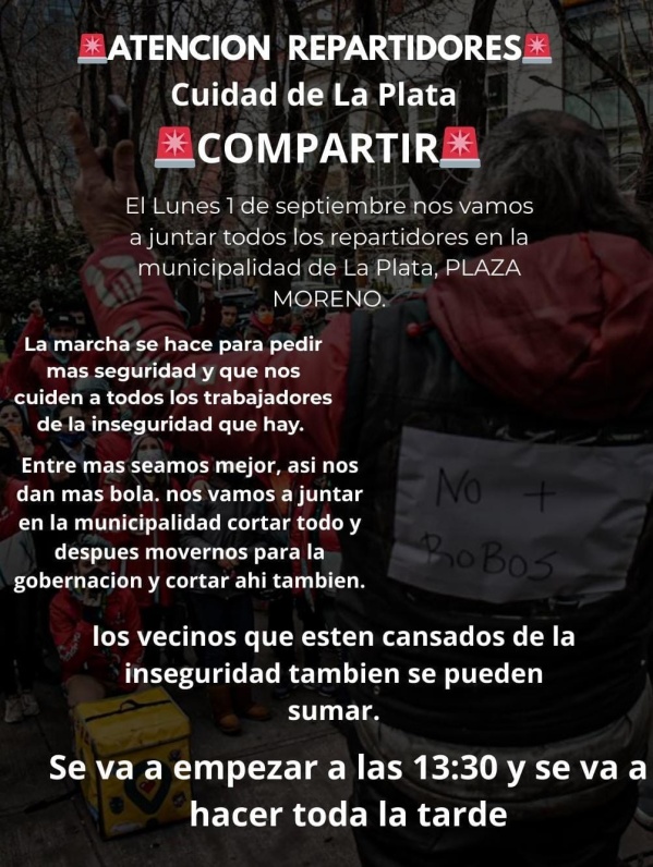 El reclamo no solo busca visibilizar la realidad de quienes se desempeñan en plataformas de reparto, sino también sumar a los vecinos afectados por los hechos delictivos en diversos barrios.