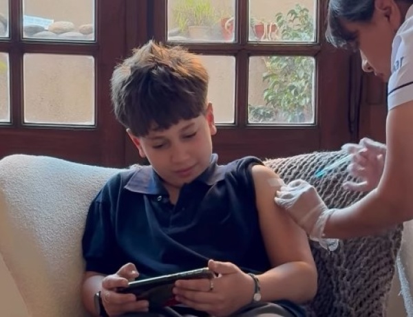 En los videos publicados, se puede ver la llegada del personal médico al domicilio de la artista. La atención comenzó con Momo, el hijo mayor, quien se mostró muy tranquilo durante la aplicación. Sentado y entretenido con su celular, el niño no mostró signos de temor mientras una profesional de la salud le aplicaba la inyección en el brazo. Su actitud relajada reflejó la confianza que generó el entorno y la presencia de su mamá.