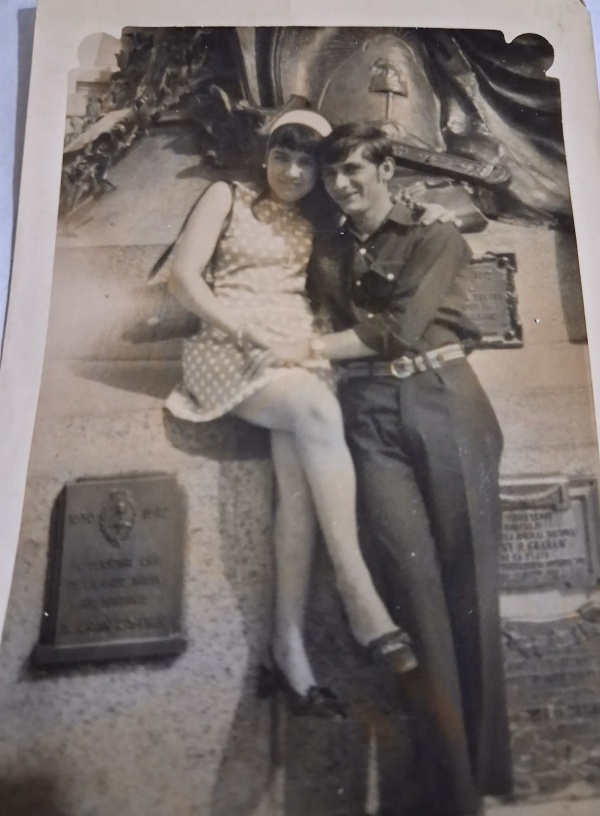 En la imagen se los ve sonrientes, posando muy juntos frente a un monumento. Ella, de vestido corto a lunares y vincha blanca; él, con camisa oscura, pantalón a la cintura y un cinturón llamativo, la rodea con el brazo. La foto conserva no solo la moda de la época, sino también un vínculo que Mabel jamás olvidó