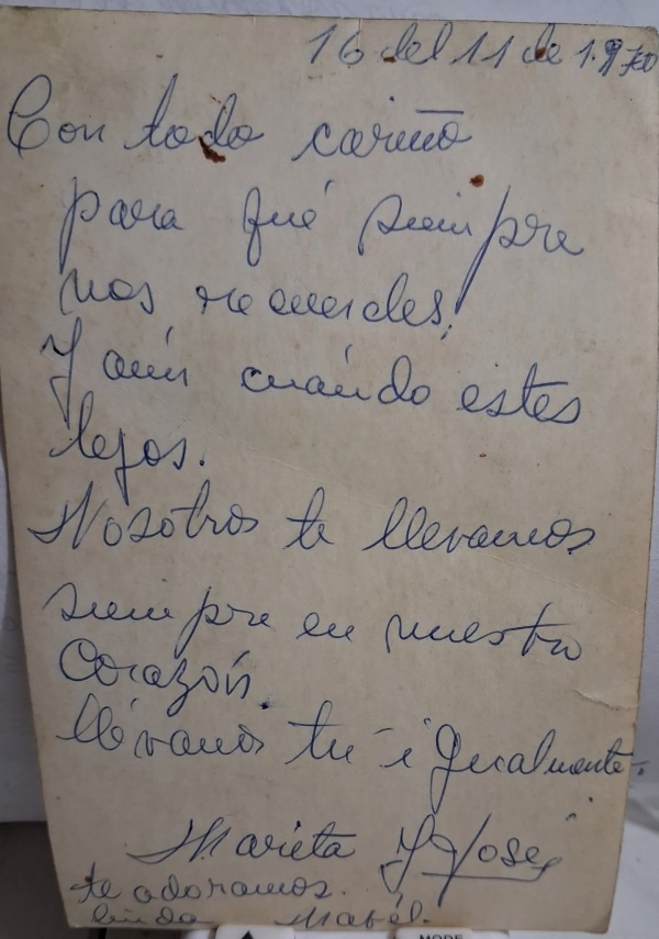 La imagen, en blanco y negro, conserva un mensaje escrito a mano: “Con todo cariño, para que siempre nos recuerdes y aun cuando estés lejos nosotros te llevemos siempre en nuestro corazón. Llévanos tú igualmente. Marieta y José. Te adoramos, linda Mabel. 16 de noviembre de 1970”.
