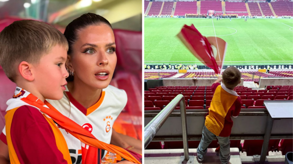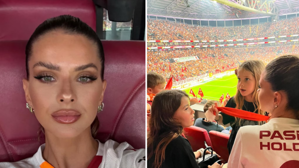Otra imagen muestra un primer plano de la actriz con maquillaje impecable y el pelo recogido, luciendo la camiseta del Galatasaray. El fondo desenfocado deja ver el contexto vip del estadio, mientras refuerza la sensación de apoyo familiar y acompañamiento a su pareja futbolista.