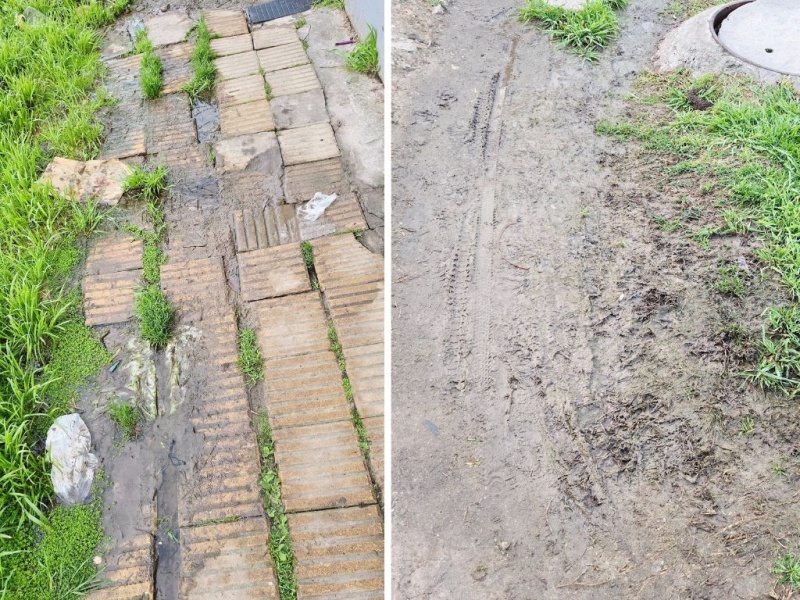Además, en las partes donde se formó el barro, hay marcas de ruedas de bicicletas, que también son propensas a sufrir patinazos por el suelo resbaloso.