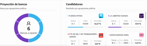 El oficialismo, encabezado por Kicillof, logró una contundente victoria y obtuvo el 46,93% de los votos frente al 33,86% de LLA. Esto hace que pueda retener 37 de las 39 bancas que estaban en juego. Cabe recordar que la participación del electorado fue del 63,19% del padrón.