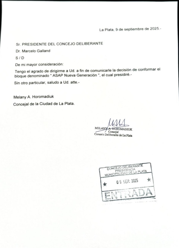 La concejal Melany Horomadiuk rompió con el bloque “Ahora La Plata” en el Concejo Deliberante local y anunció la conformación de uno nuevo denominado “ASAP Nueva Generación”. La salida de la edil tiene que ver con una interna de los principales armadores.