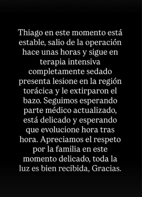 Posteriormente, la influencer nombró que tras su salida del quirófano está “completamente sedado”. “Presenta lesiones en la región torácica y le extirparon el bazo. Seguimos esperando parte médico actualizado, está delicado y esperando que evolucione hora tras hora. Apreciamos el respeto por la familia en este momento delicado, toda la luz es bien recibida, Gracias”.