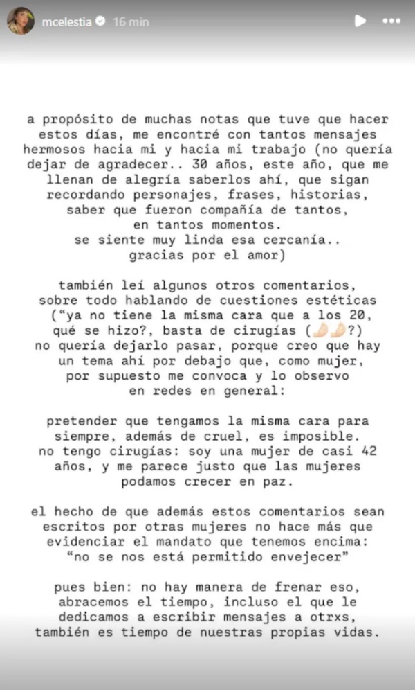 Sobre la polémica por sus supuestos cambios faciales agregó: “Leí otros comentarios, sobre todo aquellos que hablaban de cuestiones estéticas (‘ya no tiene la misma cara que a los 20’, ‘¿qué se hizo?’, ‘basta de cirugías’). No quise dejarlo pasar, porque creo que hay un tema de fondo que, como mujer, por supuesto me convoca y que observo en las redes en general” comentó la actriz.