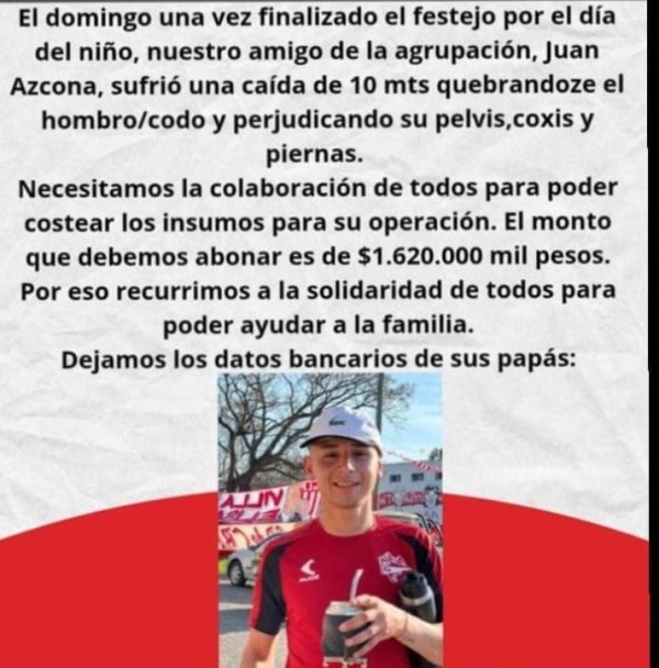 Todo era felicidad hasta que se dio un trágico hecho en el que uno de los jóvenes organizadores del evento sufrió un accidente al caer de una pared de 10 metros de altura, a la hora de bajar una bandera que estaba colgada. El chico se llama Juan Azcona, quien es integrante y amigo de la agrupación Los Pibes de City Bell.