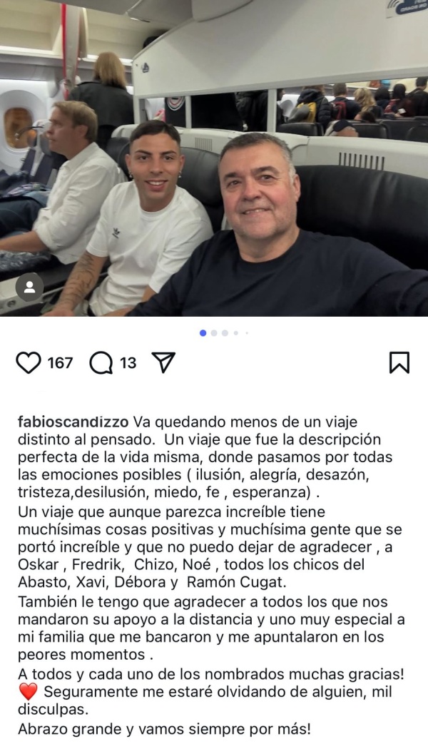 En otra parte del comunicado virtual Scandizzo agregó: "Un viaje que aunque parezca increíble tiene muchísimas cosas positivas y gente que se portó increíble y que no puedo dejar de agradecer y uno muy especial a mi familia que me bancaron y me apuntalaron en los peores momentos"