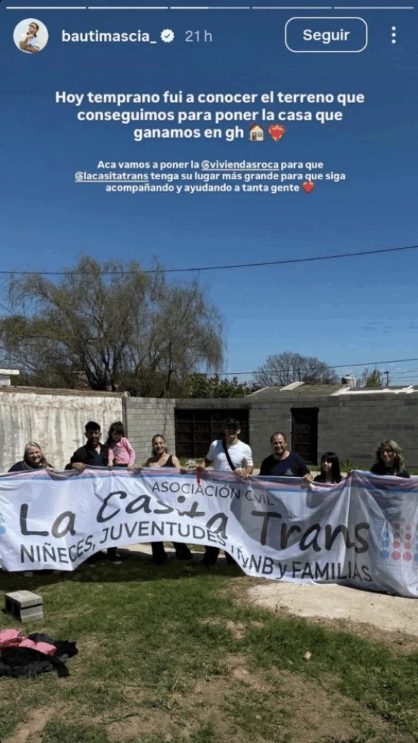 En ese marco, desde La Casita Trans celebraron la visita de Mascia y agradecieron el gesto solidario: “Hoy nos visitó Bautista Mascia en el terreno donde pronto instalaremos la casa que nos donó, premio que recibió como ganador de GH 2024”, expresaron en sus redes.