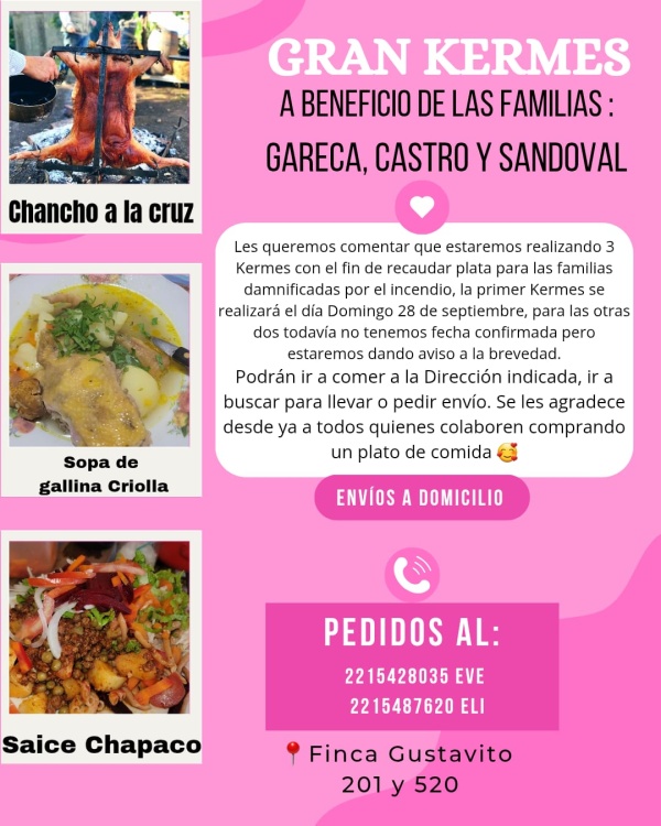 A su vez, los que deseen colaborar podrán hacerlo en dicho evento para consumir o retirar comida, aunque también pueden solicitar envíos a domicilio. Los números de referencia son los de 2215482035(Eve) y 2215487620 (Eli), dos de las organizadores de la actividad.