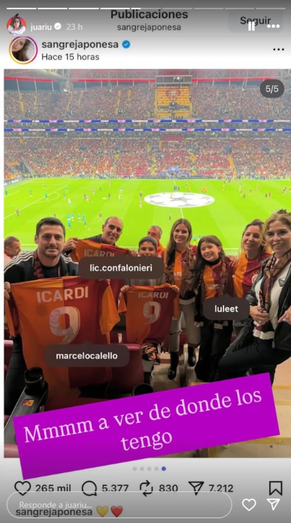 La información fue compartida por Juariu a través de sus historias de Instagram, donde mostró imágenes de la China en el estadio del Galatasaray, acompañada por un grupo de colaboradores. La influencer tucumana se preguntó en tono irónico: “¿A ver de dónde los tengo?”, y rápidamente señaló que varios de esos rostros coincidían con antiguos integrantes del equipo de trabajo de Wanda.