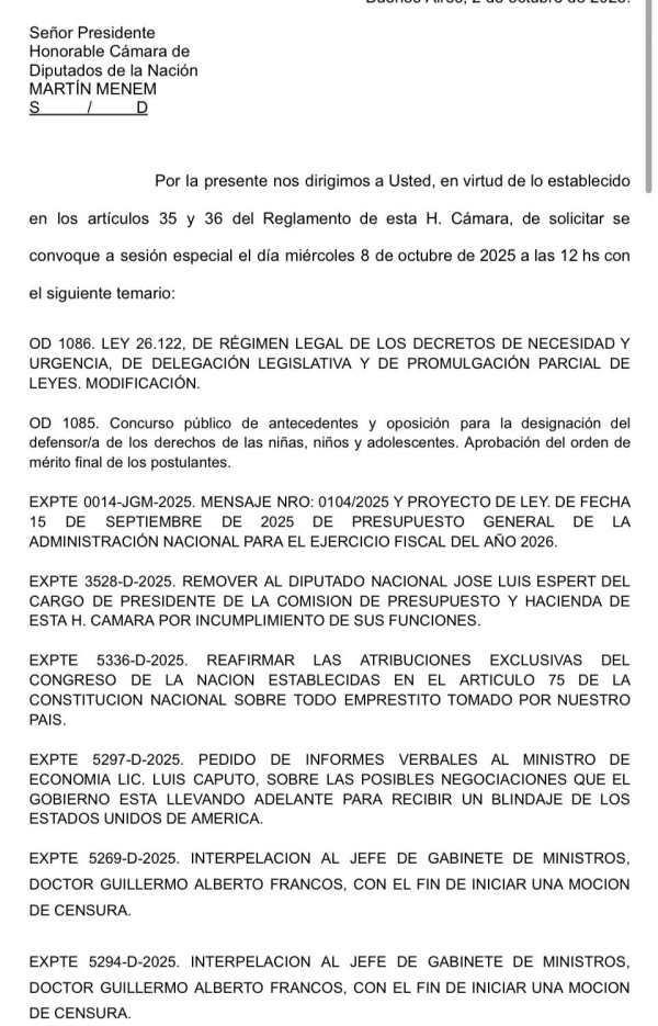 La agenda opositora suma además un emplazamiento a la Comisión de Presupuesto para evitar que el tratamiento del Presupuesto 2026 se dilate y termine el año sin dictamen, lo que habilitaría al Gobierno a seguir prorrogando el presupuesto 2023.