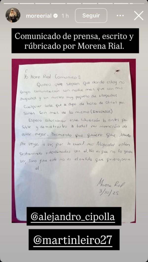 En las últimas horas realizó otro posteo una imagen en la que se ve una carta escrita a mano por ella que dice: “Quiero que sepan que donde estoy no tengo comunicación con nadie más que mis abogados y un núcleo muy pequeño de allegados. Cualquier cosa que se diga de boca de otras personas son más de lo mismo (inventos)”.