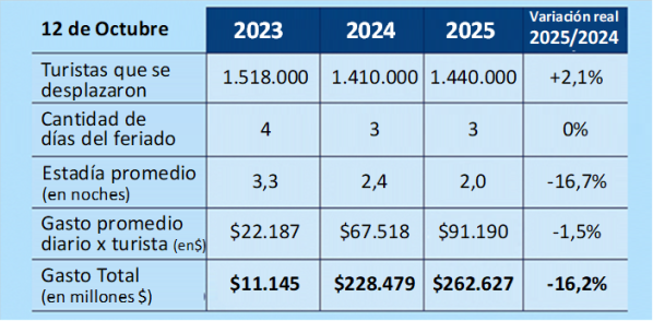 Durante el fin de semana largo por el Día del Respeto a la Diversidad Cultural, se movilizaron 1,44 millones de turistas en todo el país, un 2,1% más que en el mismo feriado de 2024. Sin embargo, la estadía promedio bajó a 2 noches, frente a las 2,4 del año pasado, reflejando un intento por ajustarse al contexto económico sin dejar de viajar.
