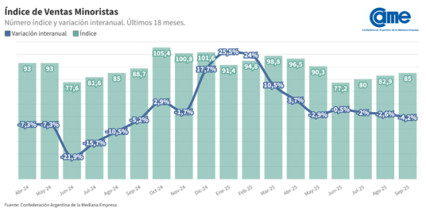 De acuerdo al registro entre el periodo de septiembre de 2024 hasta el mes pasado del presente año, las ventas minoristas pymes registraron una caída interanual del 4,2% a precios constantes, mientras que, en la comparación mensual desestacionalizada, la variación fue de -2%. En lo que va del año, acumulan un incremento interanual del 5%.