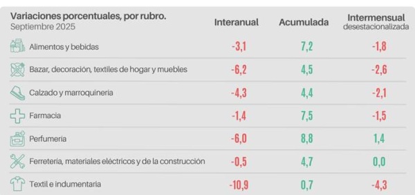 En el análisis por rubros, la situación fue homogénea, con caídas interanuales en todos los sectores. Los más afectados fueron Textil e indumentaria (-10,9%) y Bazar, decoración, textiles para el hogar y muebles (-6,2%). En la comparación intermensual, la tendencia fue similar, salvo en Perfumería, que registró un crecimiento del 1,4% respecto del mes anterior, y en Ferretería, materiales eléctricos y de la construcción, que mantuvo los mismos niveles de ventas.