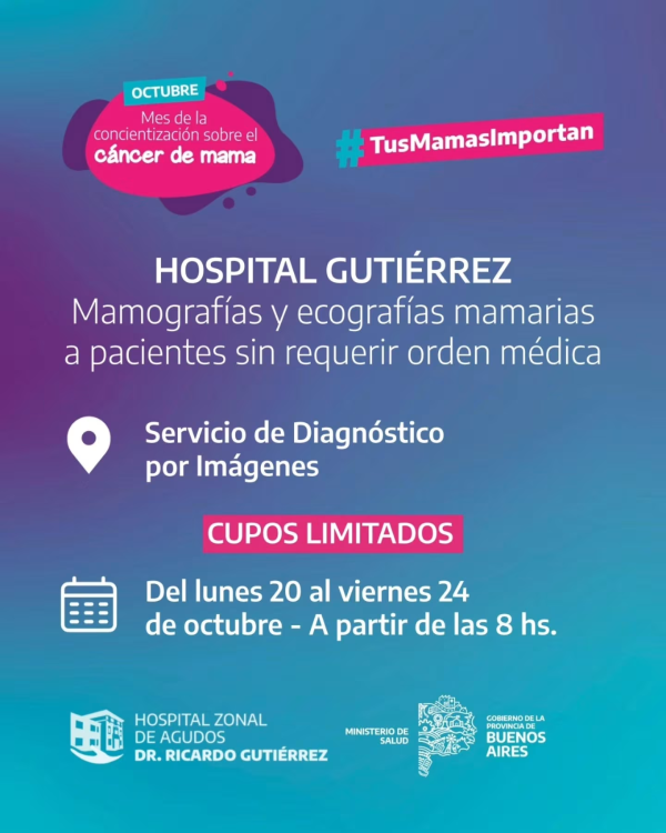 En el marco del Mes de la Concientización sobre el Cáncer de Mama, el Hospital Gutiérrez de La Plata llevará adelante una campaña especial destinada a promover la detección temprana de esta enfermedad. La iniciativa se desarrollará en la sede ubicada en Diagonal 114 entre calles 39 y 40.
